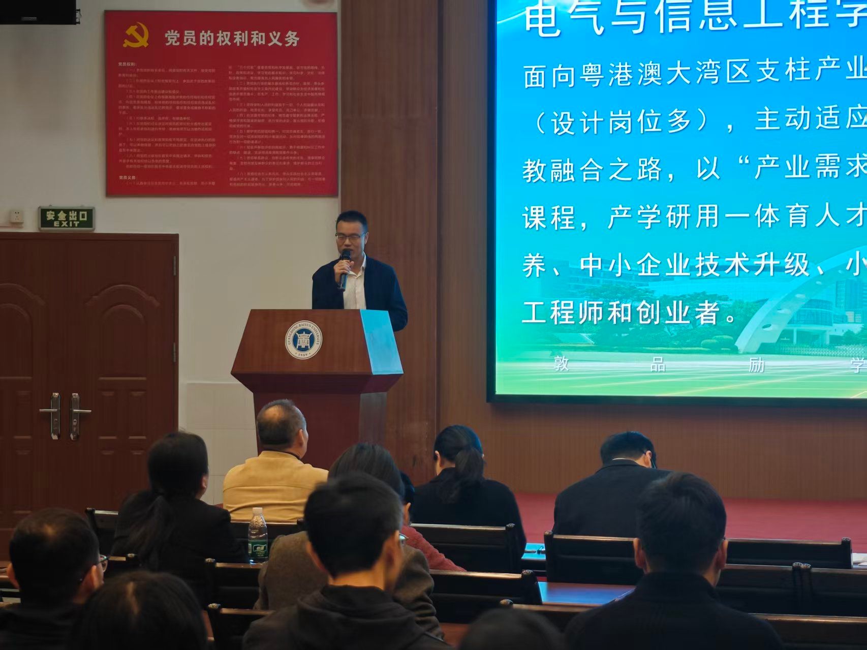 会议开始,教学副院长熊宇在汇报中系统梳理了学院教学工作总体态势,直面课堂管理、产教脱节、新技术融合不足等挑战。他提出四项系统性改革举措:以行业与人工智能技术为导向重构2025级人才培养方案;大力推动课程团队建设;促进教学与学生工作协同育人;在学院层面首创“人工智能技术小组”。作为电气工程及其自动化专业负责人,熊宇还展示了该专业对接国家“双碳”目标与粤港澳大湾区产业升级需求的创新实践,通过将AGV小车、工业电路板等真实产品转化为教学案例,构建“以产品为考核成果”的项目化教学模式,实现了从学习工具到工程设计的完整闭环。