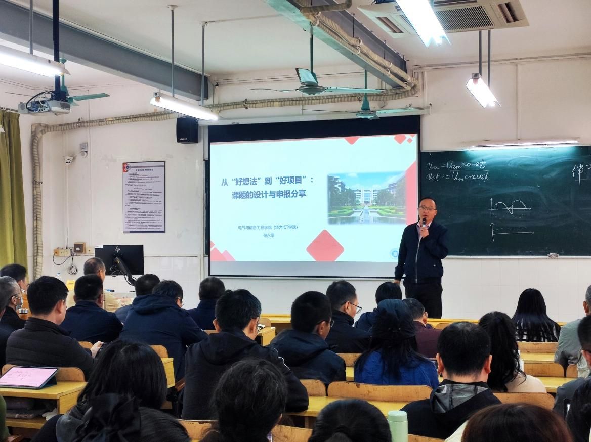 12月25日下午,电气与信息工程学院及华为ICT学院副院长张永棠教授为全体教师带来了一场题为《从“好想法”到“好项目”:课题的设计与申报分享》的专题讲座。张教授以他2025年获批教育部人文社科研究规划项目为实例,深入剖析了课题申报的核心逻辑与成功关键。