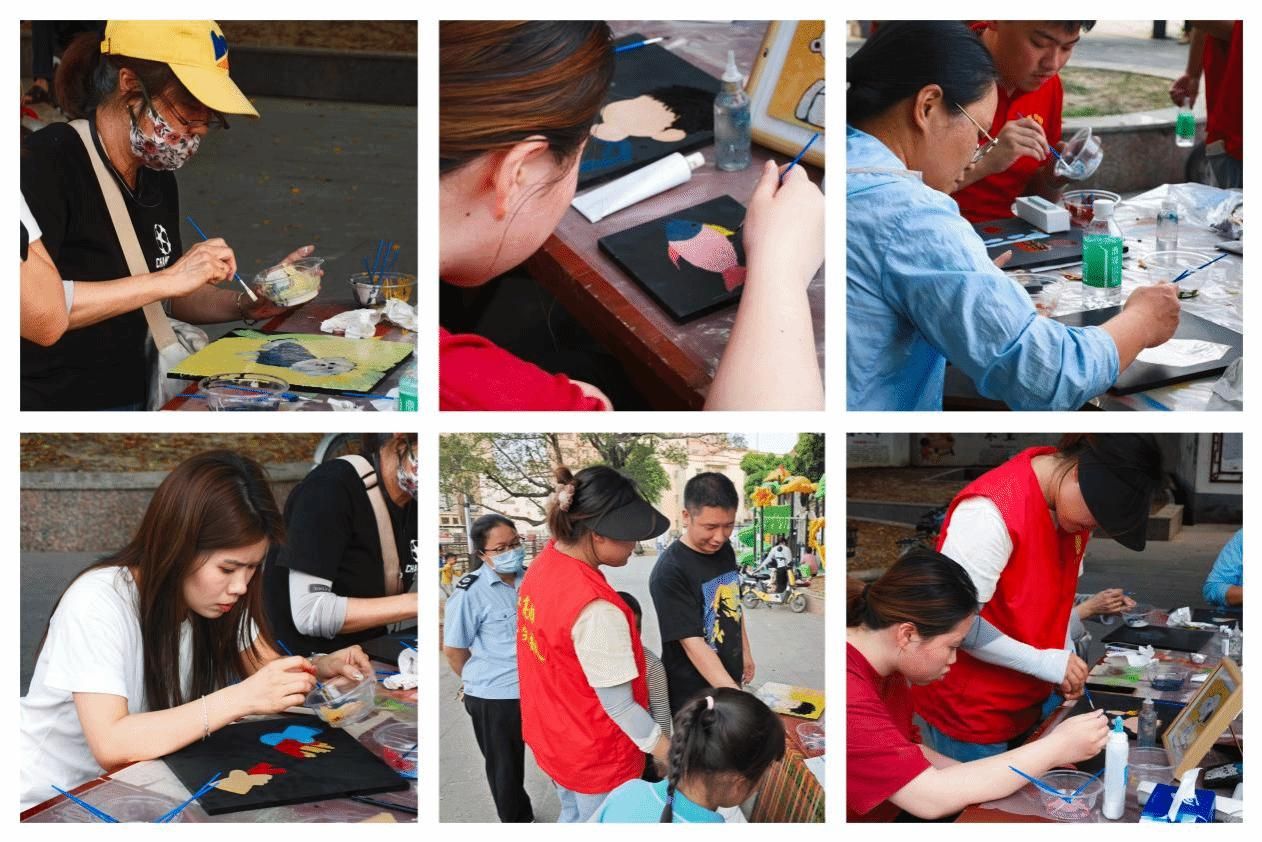 创作之余,村民与学生党员相互交流创作心得,艺术的氛围在彼此的互动中愈发浓厚。大家在亲手创作的过程中,不仅感受到漆画艺术的独特魅力,更在色彩与线条的交融中收获了艺术创作的快乐,美育的种子在潜移默化中扎根心田。