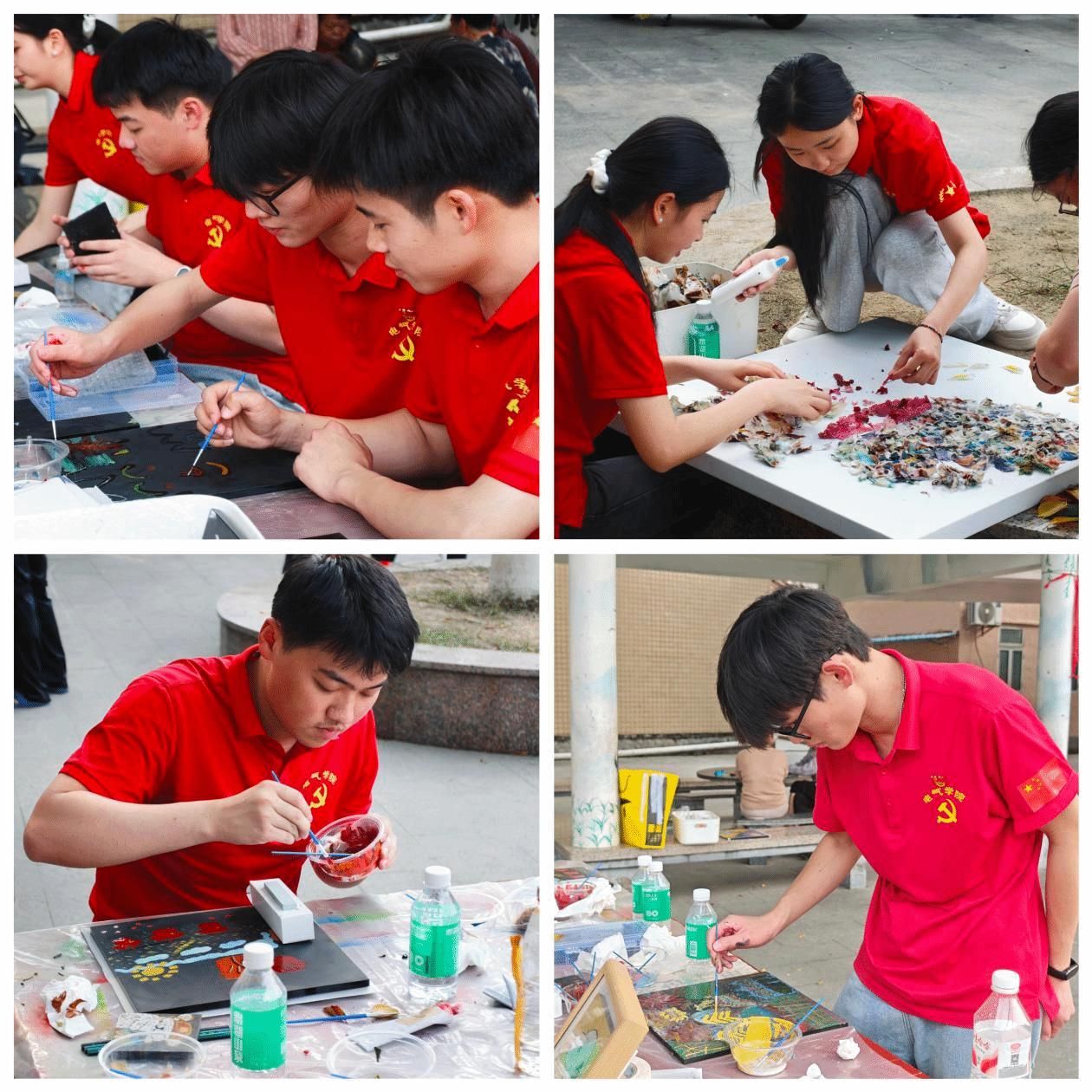 学生党员们也成为现场的创作主力军,大家充分发挥创意与想象力,在画板上大胆构思、自由创作,更有学生就地取材,收集落叶、树根、擦笔纸等自然材料,分工协作、巧妙拼贴,一幅幅生动灵动的蝴蝶图案跃然画板,让大家在创意实践中解锁了绘画的更多可能性。