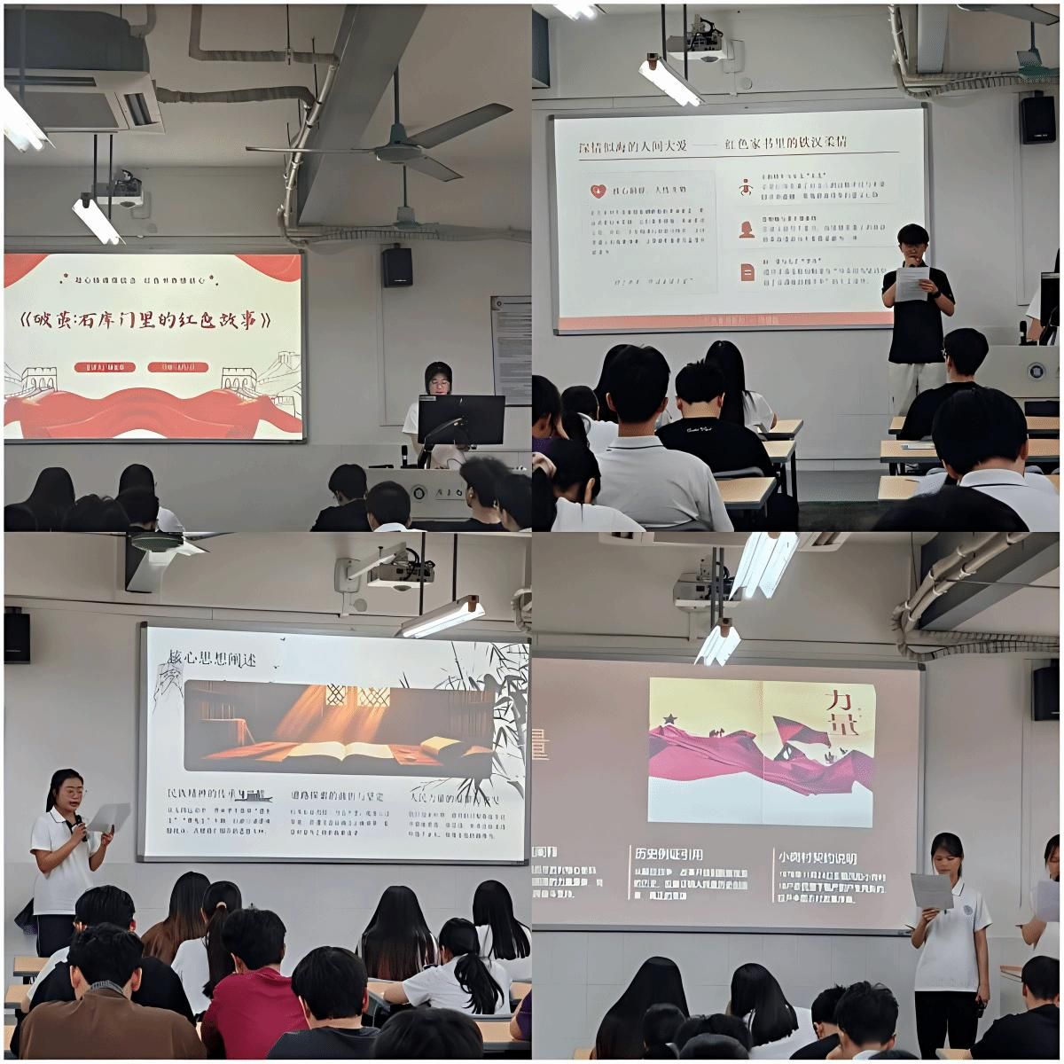 活动现场氛围浓厚,各小组依次上台分享,围绕书籍畅谈体会、传递力量。分享内容丰富多元,从革命先辈的奋斗史诗到新时代青年的使命担当,从红色历史的叙述到个人成长的反思。第一组通过《红色家书》,带领大家感受革命者字里行间的家国情怀、忠诚与坚守;第二组借《火种》回顾革命初期艰难岁月,探寻信仰之源,弘扬不畏艰险精神;第三组结合《人民至上》与新时代实践,阐释党的根本宗旨,表达服务人民的坚定决心;第四组动情讲述《红岩》中先烈坚贞不屈的事迹,抒发崇高敬意与传承红色精神之志;第十组解读《破茧》,结合时代发展探讨青年责任,激励大家突破自我、勇立潮头。