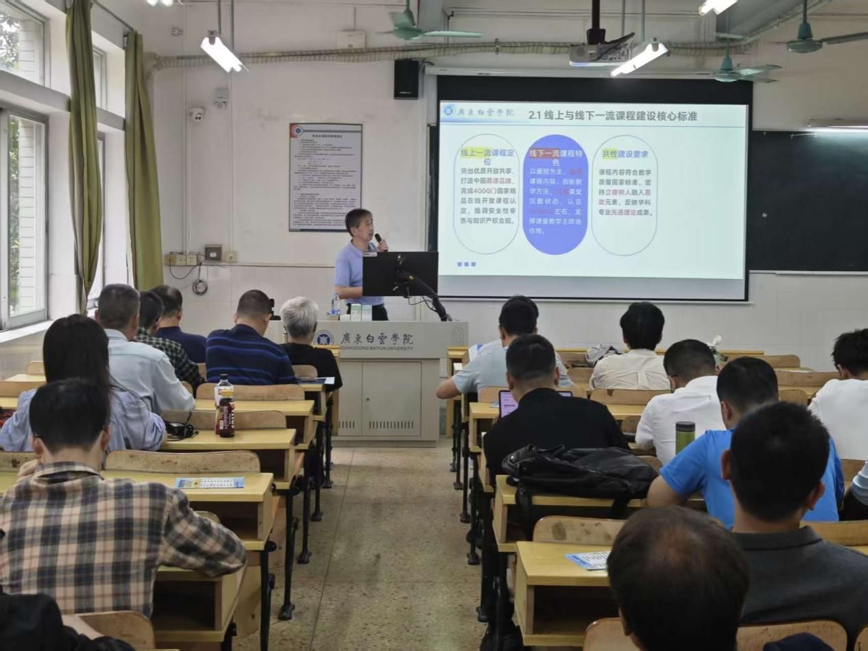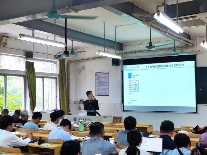 随后,邹学玉教授以“一流课程建设的创新路径与实践探讨”为核心主题,为在场教师带来了一场既有理论高度、又有实践深度的思想盛宴。讲座紧扣“两性一度”核心标准,从政策背景、建设标准、核心要素、AI赋能及申报策略五个维度,层层递进,深度剖析了智慧课程建设的底层逻辑与实操路径。