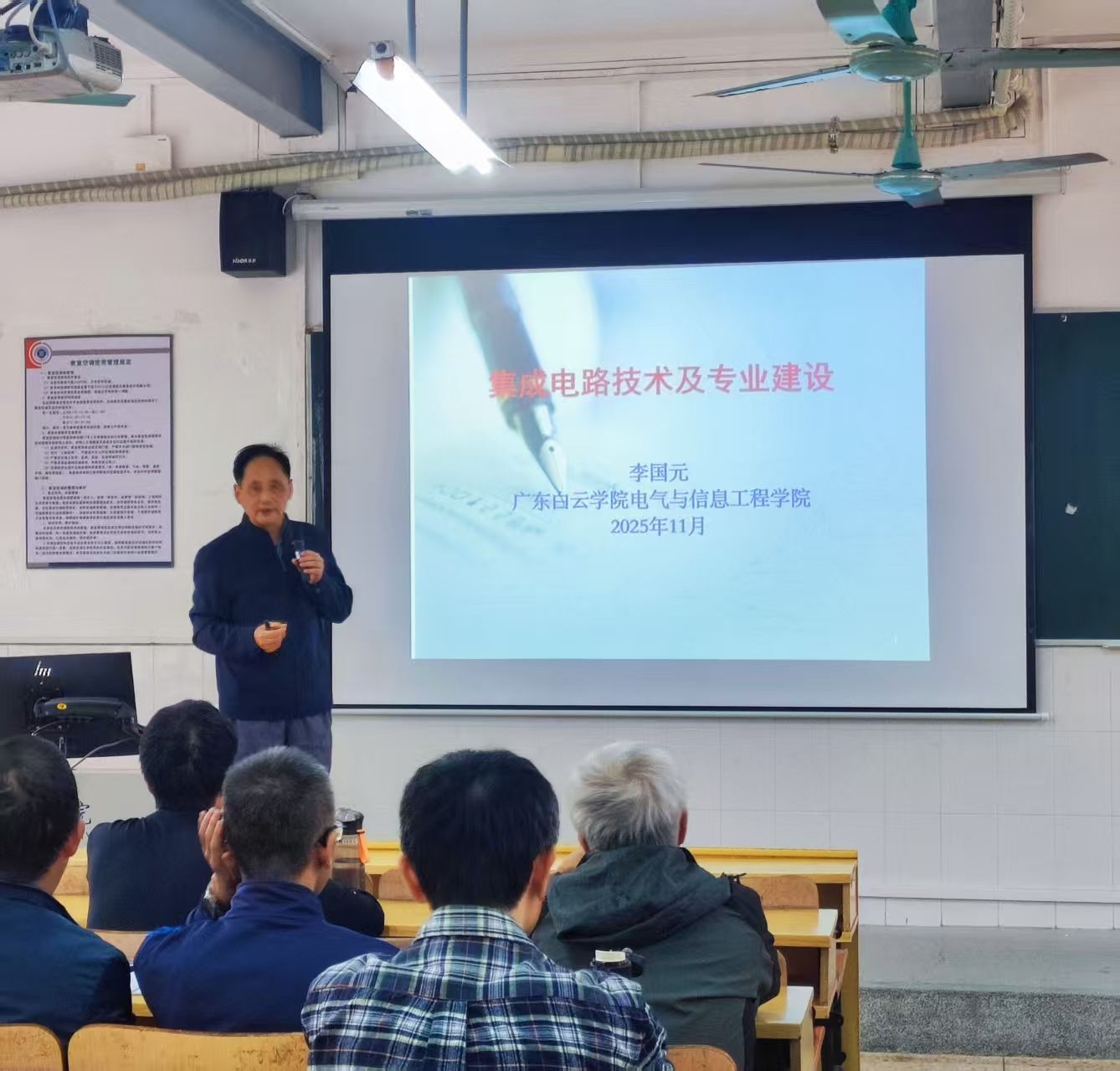 2025年11月13日下午,电气与信息工程学院在至善310举办《集成电路技术及专业建设》专题讲座。本次讲座特邀请电气与信息工程学院集成电路设计与集成系统专业负责人、银龄教师李国元教授主讲。李教授聚焦集成电路领域核心技术与专业建设关键方向,以“产业发展趋势+详细教学路径”双线并进,图文并茂,层层递进,为高校精准对接产业需求、优化人才培养体系提供了清晰指引。