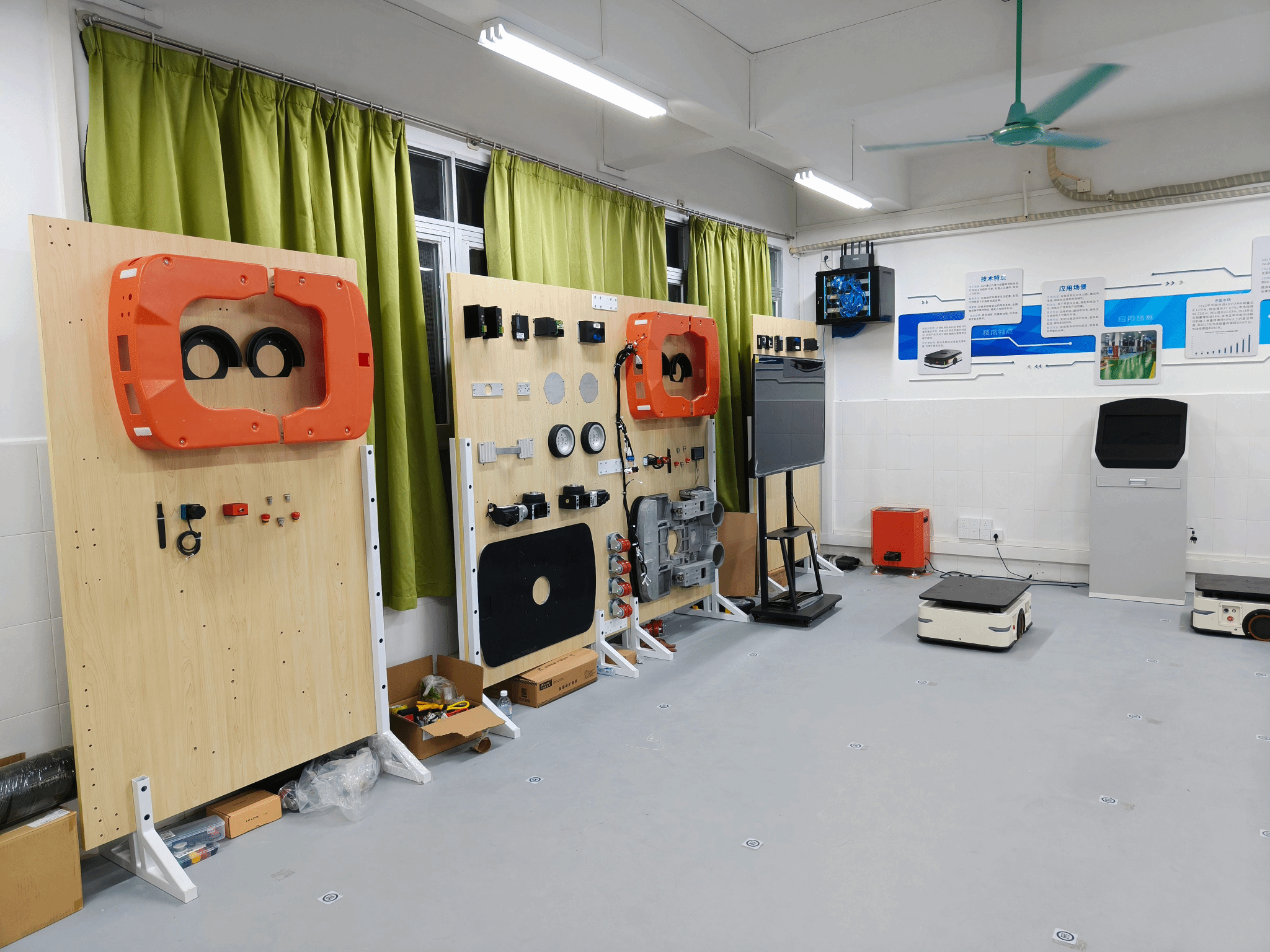 AGV电气及传感网络综合实验室是一个服务于自动化、电气工程及其自动化、物联网工程等专业的先进综合实训平台,核心功能在于提供基于真实AGV系统的深度实践教学。实验室配备3套AGV电气实验装置及多类工业传感器(超声波、激光、视觉、速度传感器),支持学生利用EPLAN等软件进行AGV电气系统原理图设计、控制电路规划及运动控制器编程;同时,学生可实践传感器选型、安装、信号采集、数据处理及特征提取,深入掌握环境感知技术;关键功能还包括构建传感网络,实现多传感器数据与控制系统(如PLC)的实时可靠通信,模拟AGV的多传感器信息融合与协同控制;实验室采用“数字孪生”模式,支持在虚拟环境中进行系统设计、仿真验证,成熟后再在实体装置上接线、调试,实现虚实结合的高效学习;通过涵盖电气设计、传感应用、网络集成、虚实验证等环节的综合性、设计性实验项目(如AGV电气系统设计、传感网络通讯实践),实验室着重培养学生解决复杂工程问题的能力,精准对接AGV电气设计、系统集成等智能制造领域核心岗位技能。