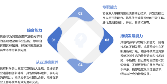 综合能力:具备华为鸿蒙应用开发相关学科的基础理论和专业技能;够综合运用这些知识,解决鸿蒙系统及其生态中的复杂问题。
